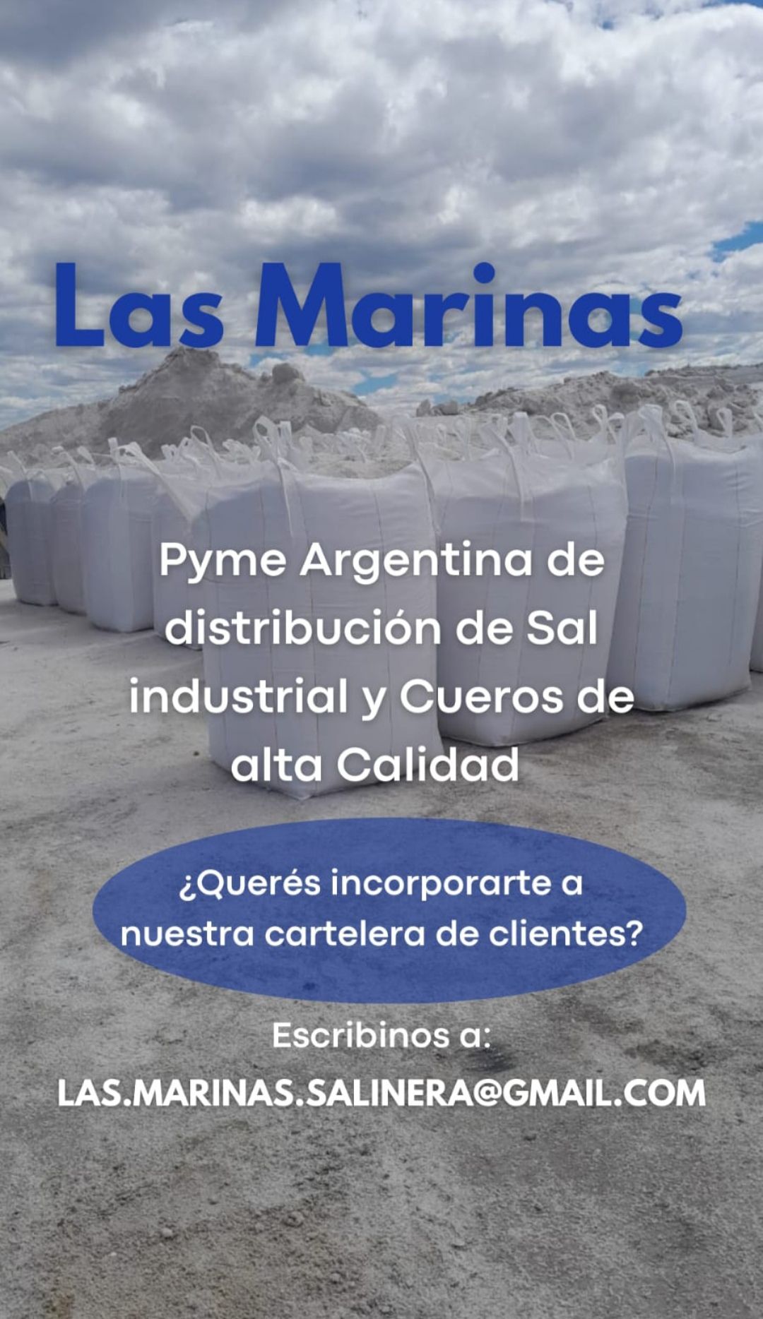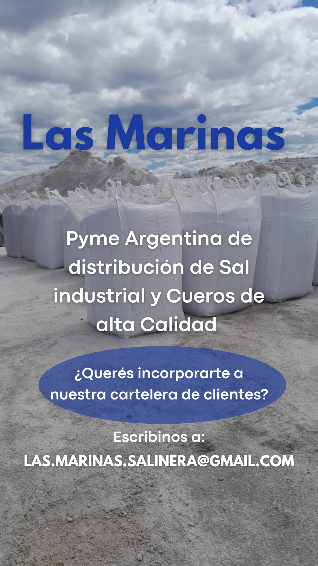 Las Marinas, emerge como una joven empresa y con una pasión inquebrantable, por la excelencia y la calidad. Desde nuestro inicio en el año 2020, nos hemos dedicado a la comercialización, asesoramiento y distribución de sal industrial, sirviendo a empresas de renombre en una variedad de rubros. Además brindamos el servicio de venta de cueros frescos y salados, a nivel nacional e internacional.